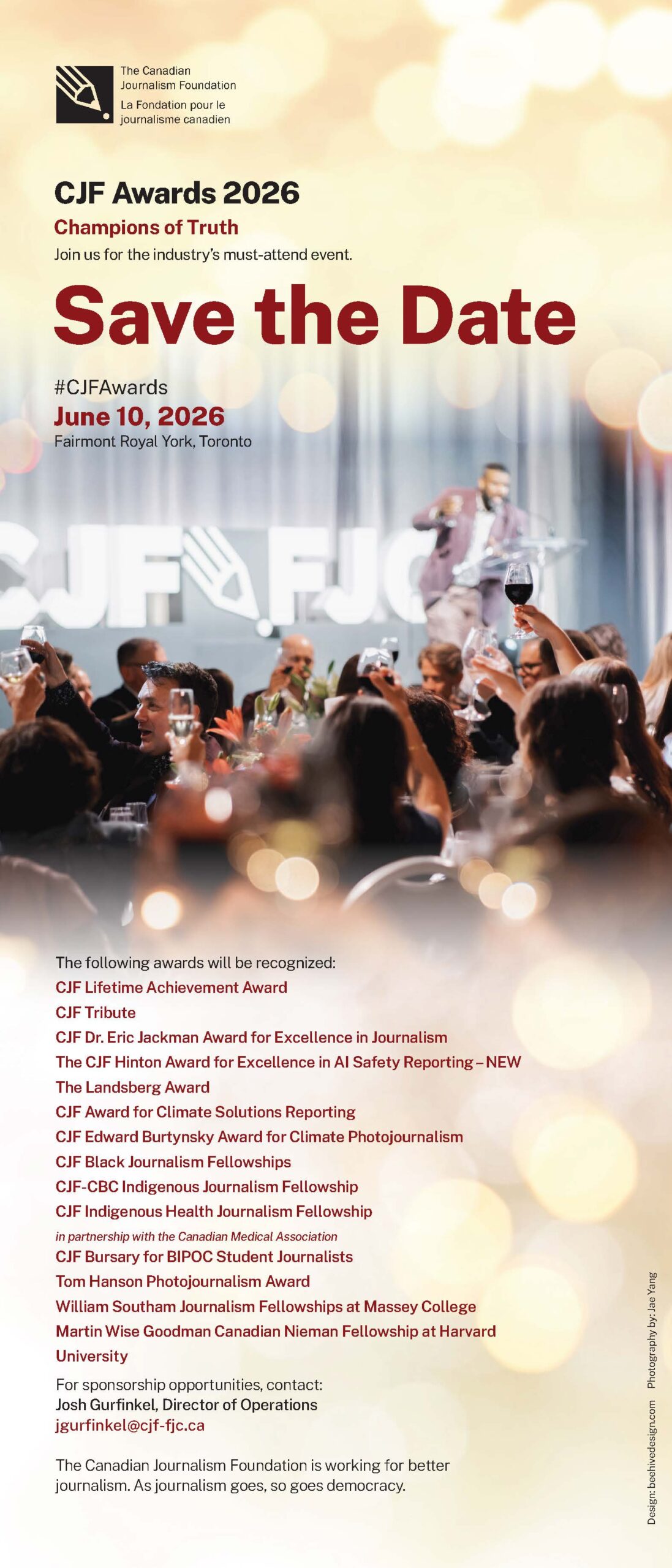 The 2026 CJF Awards will take place on June 10, at the Fairmont Royal York, Toronto.